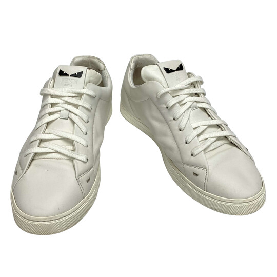 Tênis Fendi Monster confeccionado em couro na cor branca. O modelo de solado flat emborrachado e bico arredondado, traz fechamento por cadarço e detalhe de olhinhos em couro preto na lingueta.