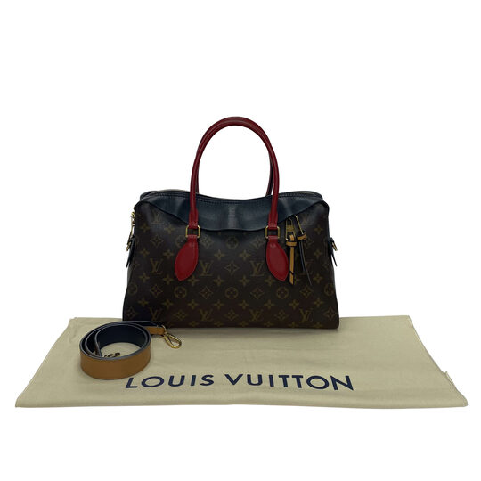Bolsa Louis Vuitton Tuileres confeccionada em canvas monograma e acabamentos em couro nas cores vermelho e preto. O modelo traz ferragens douradas, alça dupla de mão e outra longa removível por mosquetão. Possui compartimento único com três bolsos internos e fechamento principal por zíper.