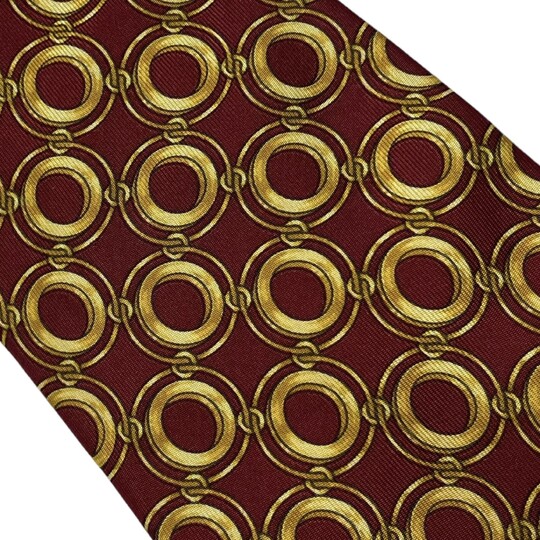 Gravata Celine confeccionada 100% em seda na cor vermelha com estampa de círculos dourados.