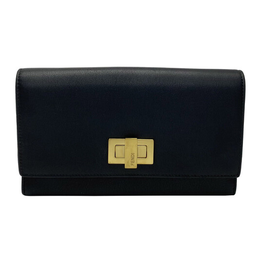 Carteira Fendi Peekaboo confeccionada em couro na cor preta. O modelo de formato retangular traz de um doa lados três compartimentos internos, sendo o central com zíper. Do outro, apresenta doze espaços para cartões e seis para documentos no geral. Possui fechamento por dispositivo de encaixe e ferragens douradas.