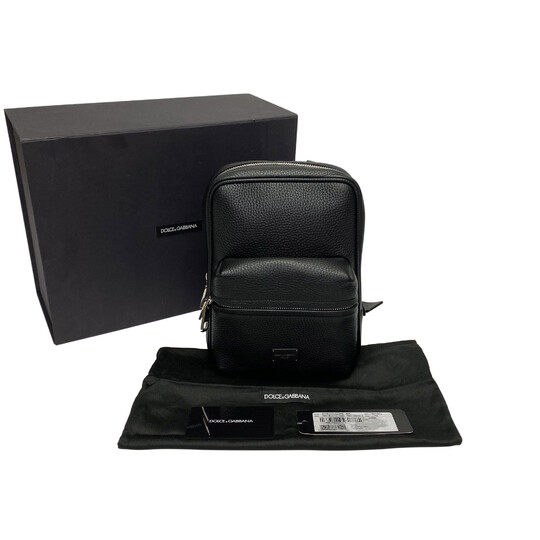 Mochila Dolce & Gabbana confeccionada em couro na cor preta. O modelo de tamanho pequeno traz duas alças de ombros ajustáveis, ferragens prateadas, fechamento principal por zíper e bolso frontal.