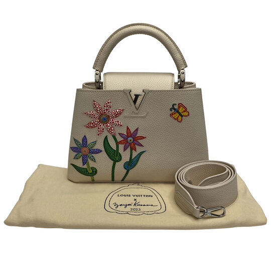 Bolsa Louis Vuitton X Yayoi Kusama Capucines BB. O modelo confeccionado em couro taurillon off white, traz uma alça de mão estruturada, outra removível por mosquetão, ferragens prateadas, detalhes florais aplicados na parte frontal e fecho de aba dobrável.
