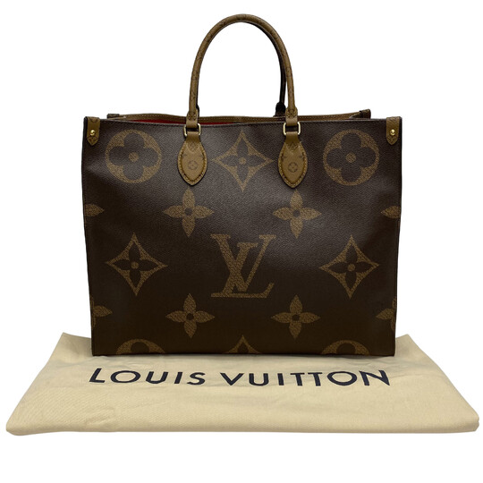 Bolsa Louis Vuitton OnTheGo GM. Confeccionada em canvas monogram giant e canvas monogram reverse, possui duas alças Toron e duas alças longas removíveis. Além disso, apresenta ferragens douradas, bolso interior e fechamento por mosquetão.