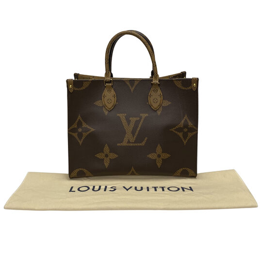 Bolsa Louis Vuitton OnTheGo MM. Confeccionada em canvas monogram giant e canvas monogram reverse, possui duas alças Toron e duas alças longas removíveis. Além disso, apresenta ferragens douradas, bolso interior e fechamento por mosquetão.