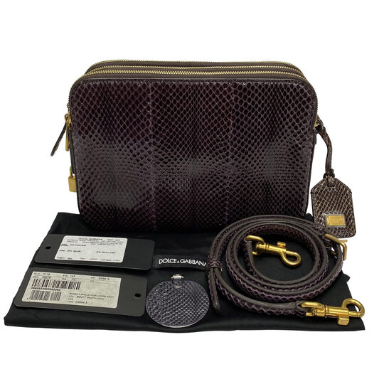 Bolsa Dolce & Gabbana confeccionada em couro de píton na cor uva. O modelo crossbody possui formato retangular, alça de ombro ajustável e removível por mosquetão e ferragens dourada. Apresenta três compartimentos com fecho principal por zíper, tag com placa em metal com nome da marca e detalhe de cadeado.