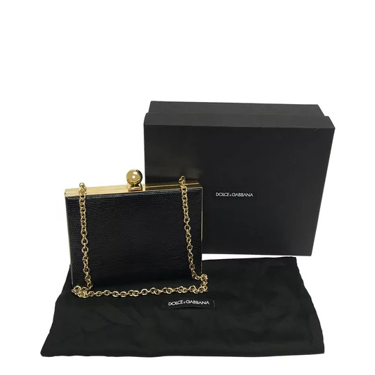 Bolsa Dolce & Gabbana confeccionada em couro na cor preta, com ferragens em metal dourado. O modelo de tamanho pequeno apresenta alça em corrente, que pode ser usada por dentro, transformando a peça em uma clutch. Possui fecho por dispositivo de encaixe.
