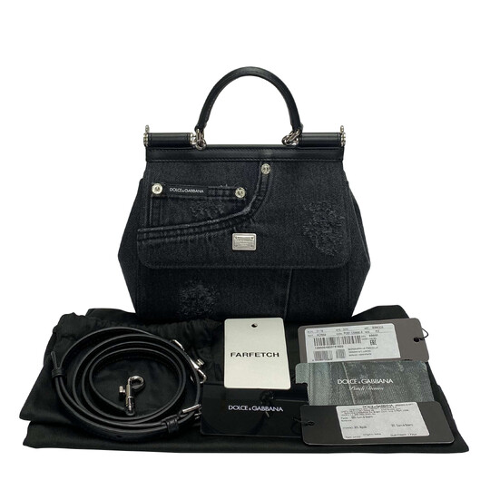 Bolsa Dolce & Gabbana Sicily confeccionada em tecido denin preto e acabamentos em couro. O modelo de tamanho pequeno traz alça estruturada de mão, outra longa removível e ajustável por mosquetão. Com ferragens prateadas, apresenta compartimento único interno e fechamento por aba com botão de pressão.