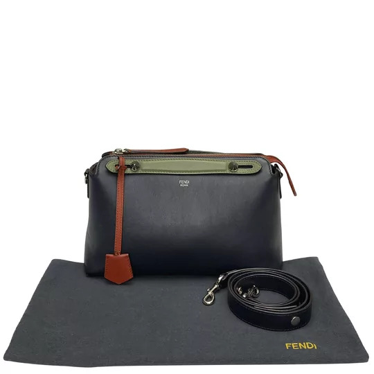 Bolsa Fendi By The Way confeccionada em couro na cor azul marinho, com detalhes em verde e vermelho. O modelo retangular possui compartimento duplo com três bolsos internos, sendo um com fecho por zíper. Conta com alça dupla de mão, alça longa auxiliar removível por mosquetão, ferragens prateadas, nome da marca em foil prateado na parte frontal e fecho por zíper.