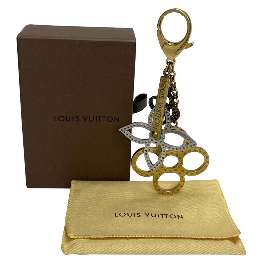Charm de Bolsa e Chaveiro Louis Vuitton. O modelo é confeccionado em metal, possui um pingente dourado, um prateado e um pingente em chumbo, todos em formato de flores e com pequenos rebites redondinhos. Contém também pingente em formato retangular com nome da marca gravado. Fechamento por mosquetão. Comprimento: 12 cm
