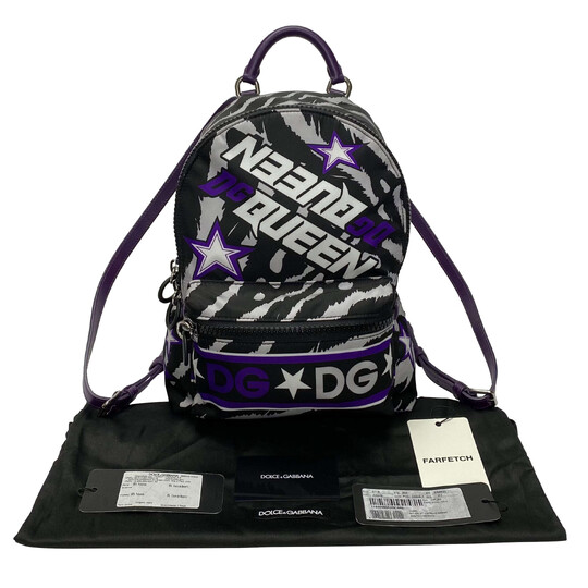 Mochila Dolce & Gabbana confeccionada em nylon com acabamentos em couro roxo. O modelo de tamanho pequeno traz duas alças de ombro ajustáveis, uma de mão, bolso externo, fechamento principal por zíper e ferragens prateadas.