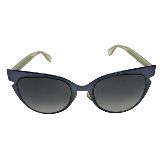 Óculos de Sol Fendi FF 0133/S. O modelo é confeccionado em metal na cor azul. Possui formato cat eye, lentes marrons degradê, hastes em acetato azul com detalhes em verde.
