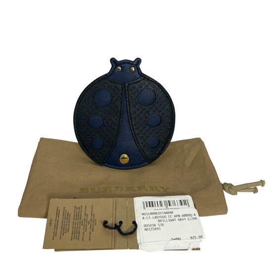 Porta-Moedas Burberry confeccionado em couro em formato de joaninha nas cores marinho e preto. Possui ferragens douradas e fechamento por botão de pressão.