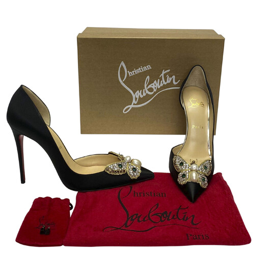 Scarpin Christian Louboutin Barzas confeccionado em cetim preto. O diferencial da peça está na aplicação de borboleta na parte da frente, com cristais Swarovski e metais dourados. As laterais internas são abertas, com as externas fechadas e traseira com apoio para o calcanhar. Os bicos e saltos são finos. O solado é vermelho no tom tradicional da marca.