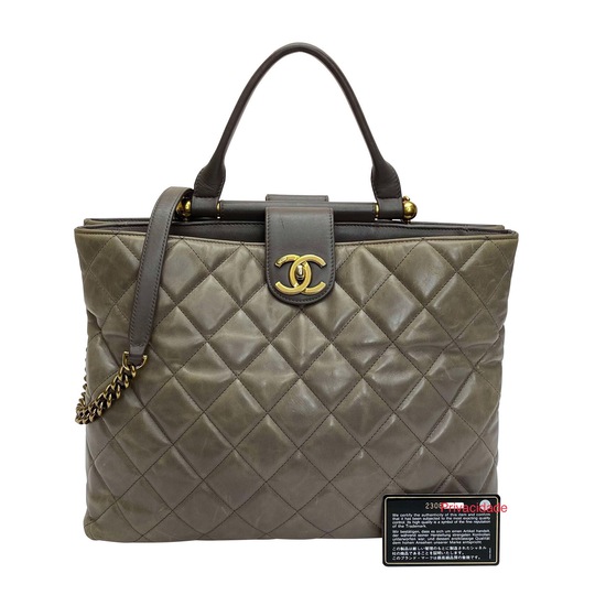 Bolsa Chanel Shoulder confeccionada em couro lambskin na cor cinza com acabamentos em marrom. O modelo de tamanho médio traz uma alça de mão, outra de ombro com detalhe de corrente e compartimento duplo interno com um bolso com zíper. Possui ferragens douradas com acabamento envelhecido e fechamento principal por dispositivo de encaixe com logotipo CC da marca.