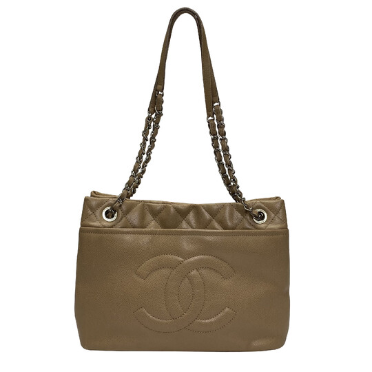 Bolsa Chanel Timeless CC Shopping Tote. O modelo é confeccionado em couro caviar na cor bege. Possui alça de ombro em couro e corrente, logo CC frontal, bolso externo frontal e posterior, base e borda superior em textura matelassê. Conta com compartimento único amplo, três bolsos e ferragens prateadas. Fechamento por botão magnético.