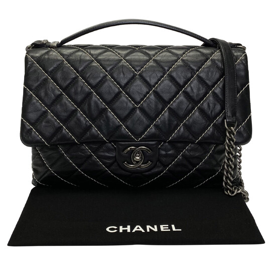 Bolsa Chanel confeccionada em couro Chevron na cor preta com pespontos brancos. O modelo traz uma alça estruturada de mão, outra longa com detalhe de corrente, ferragens prata envelhecidas e fechamento por aba com dispositivo de encaixe.