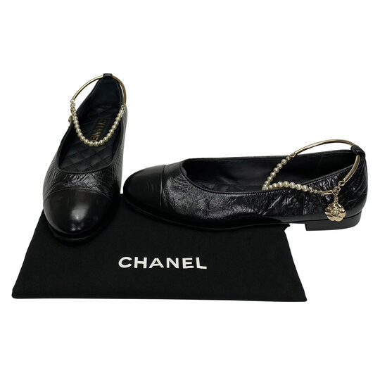 Sapatilha Chanel Cap Toe Ankle Chain confeccionada em couro na cor preta. O modelo traz bico arredondado, tira com pérolas e pingente com CC cravejado de cristais.