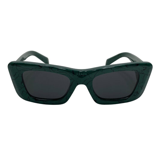 Óculos de Sol Prada - SPR13Z. O modelo é confeccionado em acetato verde marmorizado e oferece um design elegante em formato gatinho.