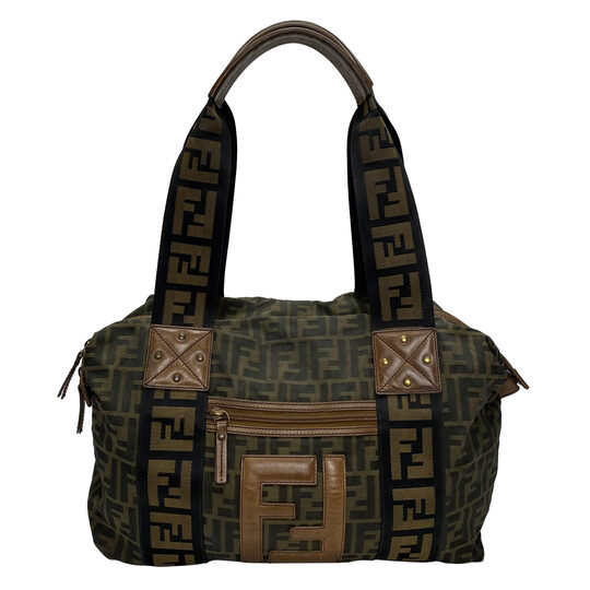 Bolsa Fendi confeccionada em canvas com estampa de monograma da marca e acabamentos em couro marrom. O modelo de tamanho grande traz duas alças de ombro, bolso externo frontal e fechamento principal por zíper.
