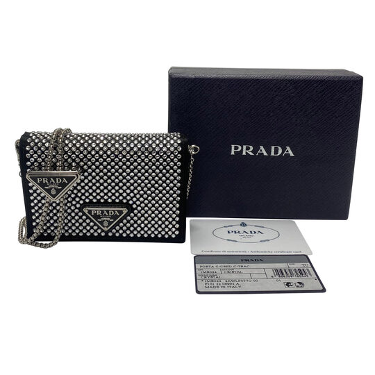 Bolsa Prada Micro Card Holder. O modelo de tamanho micro é confeccionado em cetim na cor preta e decorada com cristais. Possui ferragens prateadas, alça única de ombro em corrente removível e compartimento único, com um bolso interno aberto. Possui fecho principal por botão de pressão e logo da marca aplicado na aba de fechamento.
