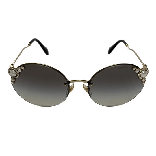 Óculos de Sol Miu Miu - SMU52T. O modelo de formato redondo é feito em metal com aplicação de pérolas nas lentes.