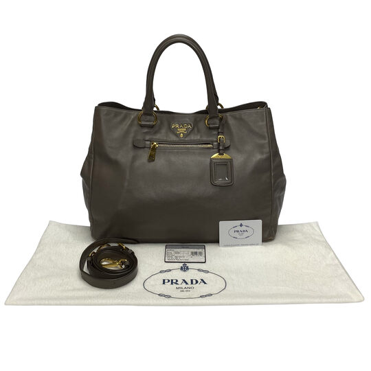 Bolsa Prada feita em couro calfskin cinza. O modelo de tamanho grande traz duas alças de mão e uma de ombro removível por mosquetão. Apresenta ferragens douradas, bolso externo frontal com zíper e nome da marca em metal.