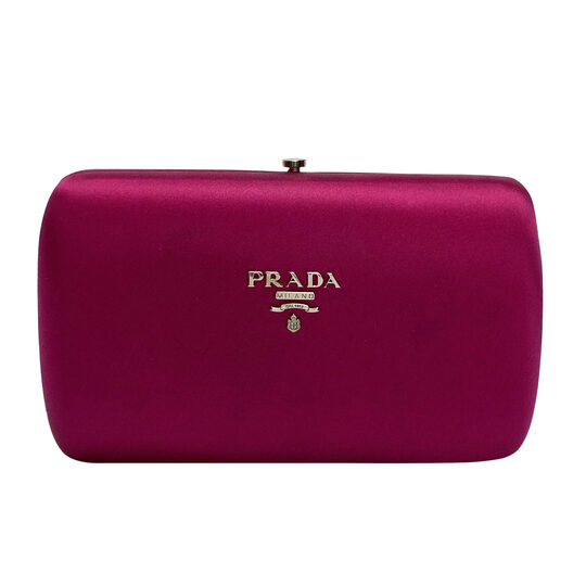 Clutch Prada confeccionada em cetim na cor rosa. O modelo de tamanho pequeno traz ferragens prateadas e logotipo da marca aplicado em metal na parte frontal.