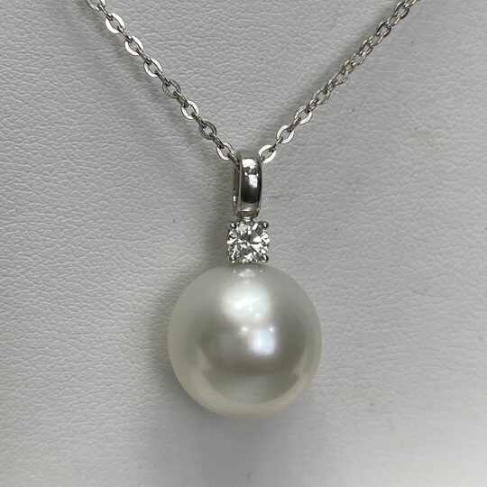 Colar Paspaley Grace confeccionado em ouro branco 18k com pingente de pérola australiana semi-redonda do Mar do Sul de 14 mm, complementada por um diamante brilhante branco de 0.25 ct.