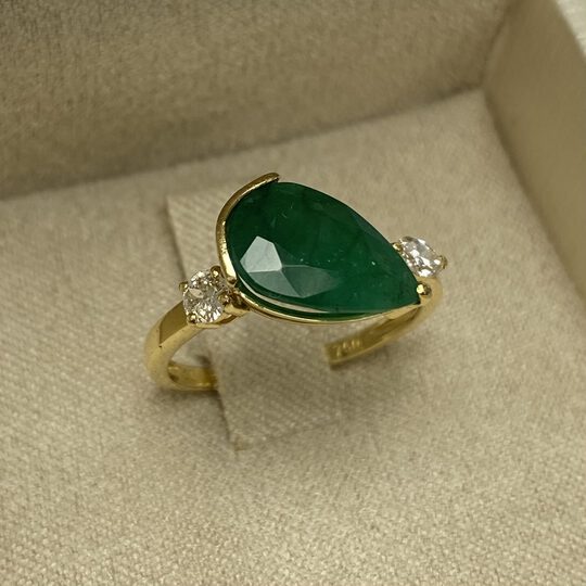 Anel em ouro amarelo 18k com uma esmeralda lapidação gota de 2.89 ct e dois diamantes lapidação navete - 0.21 ct. Aro: 16 / Peso: 2.35g