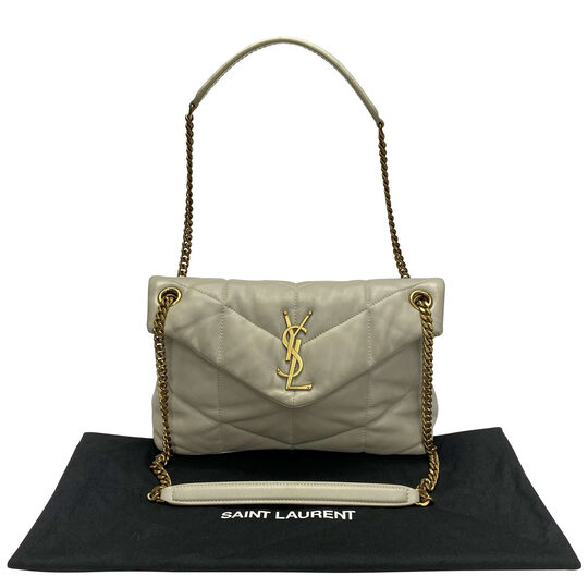 Bolsa Yves Saint Laurent LouLou Puffer confeccionada em couro na cor off white. O modelo retangular possui compartimento único com um bolso interno e fecho em zíper. Conta com alça dupla de ombro, ferragens douradas, símbolo da marca na parte frontal e fecho por aba com botão magnético.