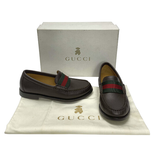 Mocassim Gucci Infantil Couro Marrom e Faixa Web Moda plus size original brechó desapego desapego de luxo segunda mão second hand usado usado e bom estado conservado bolsas usadas bolsas segunda mao etiqueta unica enjoei peguei bode bolsas conservadas cansei vendi troca de luxo