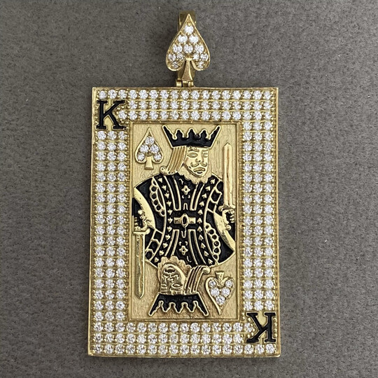 Pingente Carta de Baralho Rei de Espadas - Isabel Oliveira. O modelo confeccionado em ouro amarelo 18k traz 222 brilhantes, que juntos totalizam 3,26 ct. Peso: 29,5g