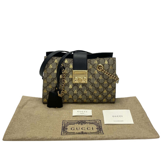 Bolsa Gucci GG Supreme Padlock Tote. O modelo de tamanho pequeno é confeccionado em canvas GG supreme bee com acabamentos em couro calfskin preto. Traz duas alças de ombro com detalhe em corrente, ferragens douradas compartimento único com dois bolsos internos abertos. Fechamento por tira com fecho pad-lock.