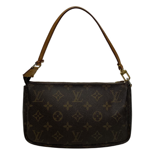 Bolsa Louis Vuitton Pochette confeccionada em canvas com estampa monograma e acabamentos em couro caramelo. O modelo de tamanho pequeno traz alça removível em couro caramelo, fechamento por zíper e compartimento único interno.