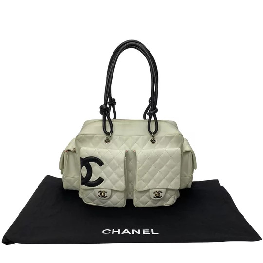 Bolsa Chanel Cambon Branca e Preta. O modelo de tamanho grande é confeccionado em couro na cor branca. Possui fecho em zíper, textura matelassê, alça dupla de ombro e um compartimento externo na parte posterior. Contém quatro bolsos externos com fecho de encaixe com o monograma da marca em metal prateado. Conta com um compartimento interno, um compartimento para celular, dois compartimentos para canetas e um bolso interno com fecho em zíper. Monograma em couro branco aplicado em um dos bolsos frontais. Ano: 2004.