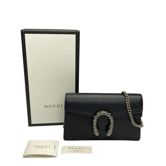 Bolsa Gucci Dionysus Super Mini. O modelo é confeccionado em couro texturizado resistente na cor preta, com formato estruturado. Apresenta alça longa em corrente prateada removível, possibilitando seu uso como clutch e também em seu interior traz um chaveiro, dessa forma você consegue prendê-la em uma bolsa maior. O destaque da peça que fica por conta da ferragem com cabeças de tigre enriquecidas com cristais Swarovski.