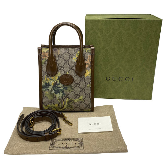 Bolsa Gucci GG Carnation Mini Tote. O modelo de tamanho pequeno é confeccionado em canvas, com acabamentos em couro e estampa de logotipo da marca e flores. Possui duas alças de mão estruturadas, outra longa removível por mosquetão e ferragens douradas.
