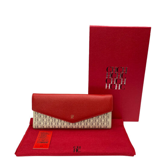 Carteira Carolina Herrera. O modelo de formato retangular é confeccionado em couro off white, com detalhes em vermelho. A carteira contém quatro compartimentos, sendo um com fecho de zíper; dez bolsos para cartão. Fecho principal por botão de pressão. Seminova, em excelente estado de conservação. Sem nenhum sinal de uso. Acompanha caixa e dust bag.