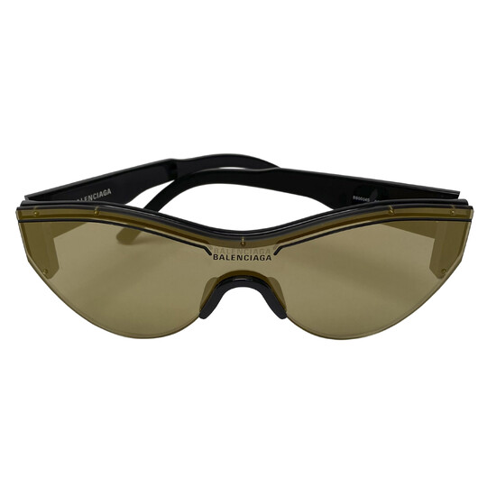 Óculos de Sol Balenciaga - BB0004S. O modelo confeccionado em acetato preto traz lentes espelhadas em amarelo.