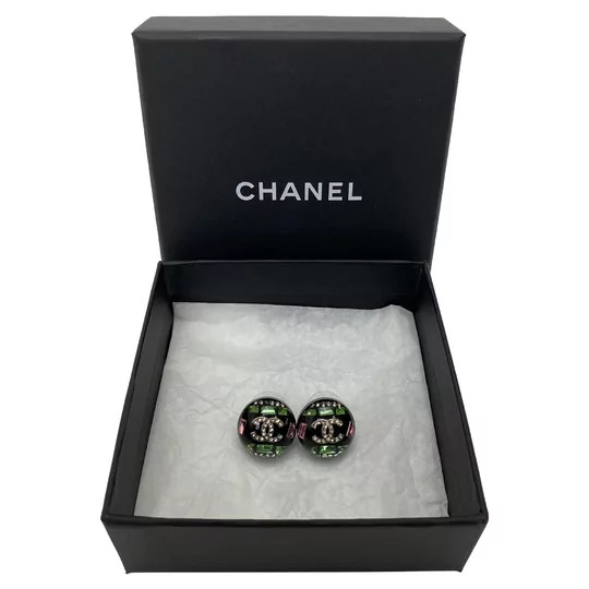 Par de Brincos Chanel confeccionados em resina na cor preta e metal dourado. O destaque da peça fica por conta do símbolo CC da marca cravejado em seu interior e das pedrinhas de cristais. Tamanho: 2 cm