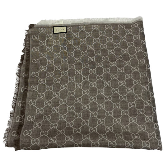 Pashimina Gucci confeccionada em lã com seda nos tons de cinza, marrom e off white, com estampa de logotipo da marca.
