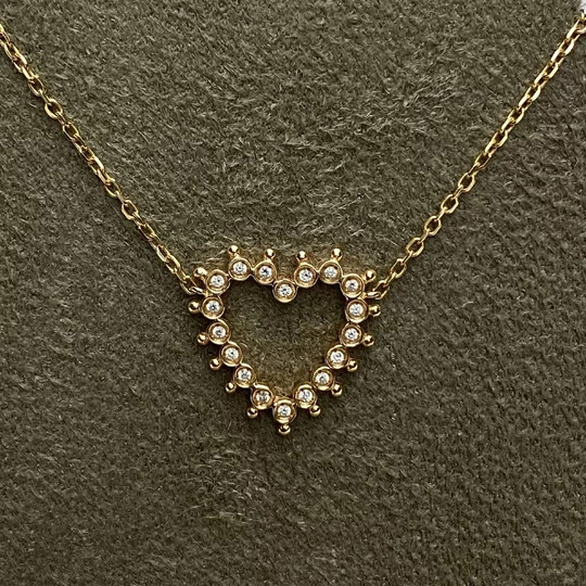Colar Carla Amorim Coração Renda-se. Uma peça clássica tanto no desenho quanto nos acabamentos. Confeccionado em ouro amarelo 18k com 18 diamantes. Tamanho do pingente: 23mm x 24mm. Comprimento da corrente aberta: 435mm.