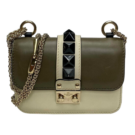 Bolsa Valentino Rockstud Glam Lock confeccionada em couro vitelo nas cores off-white e verde-musgo. O modelo retangular pequeno, possui compartimento único com aba flap e fecho por dispositivo de encaixe frontal. Alça dupla de ombro em corrente removível por dispositivo de encaixe, detalhes de studs na cor preta na parte frontal/superior e ferragens douradas.