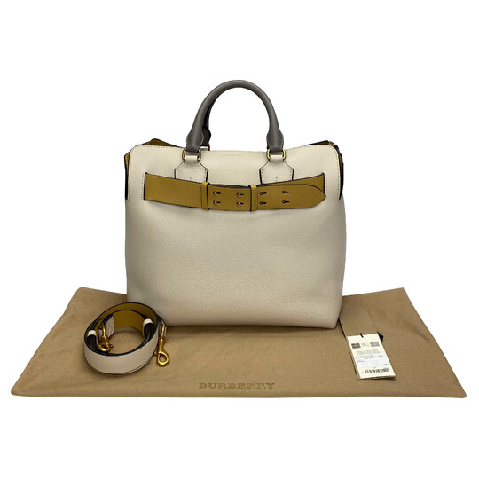 Bolsa Burberry The Belt Medium confeccionada em couro na cor off white com detalhes em amarelo e cinza. O modelo de tamanho grande apresenta duas alças de mão, uma alça de ombro ajustável e removível por mosquetão, ferragens douradas, fechamento por fivela e base de apoio.