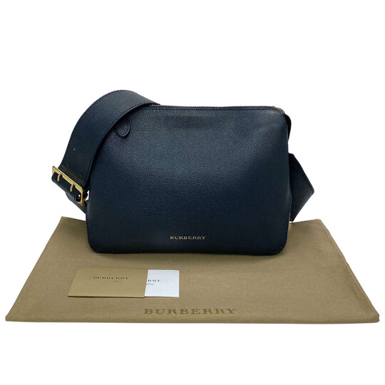 Bolsa Burberry Tiracolo confeccionada em couro na cor marinho. O modelo apresenta alça longa ajustável, detalhe em tecido xadrez nas laterais, ferragens douradas e fechamento principal por zíper.