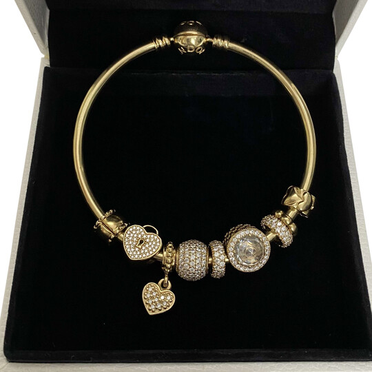 Bracelete da grife Pandora confeccionado em ouro 14K com fecho também em ouro. O modelo traz nove charms, todos em ouro e originais da marca.