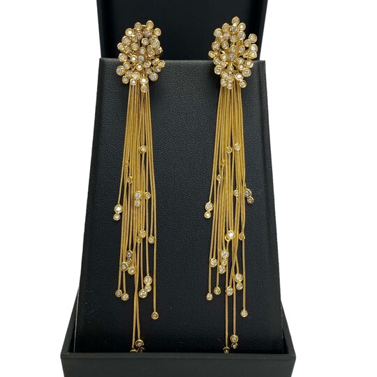 Par de Brincos Vivara, integrantes da coleção Wish. O modelo é confeccionado em ouro amarelo 18k com 2,70 ct de diamantes. Tamanho: 11 cm