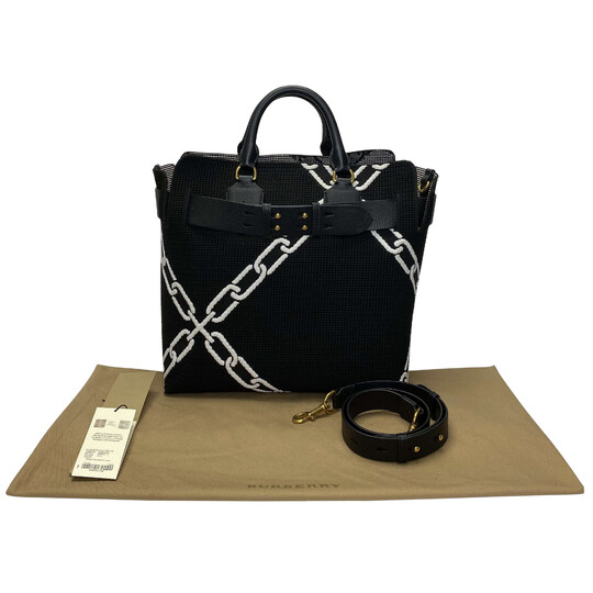 Bolsa Burberry The Belt confeccionada em tecido com acabamentos em couro na cor preta. O modelo de tamanho grande traz estampa de correntes, apresenta duas alças de mão, uma alça de ombro ajustável e removível por mosquetão, ferragens douradas, fechamento por fivela e base de apoio.
