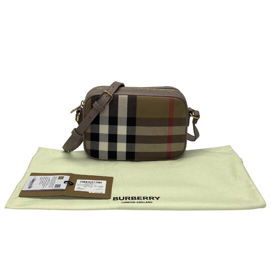 Bolsa Burberry Camera confeccionada em couro com detalhe em tecido no tradicional xadrez da marca. O modelo traz alça longa ajustável, ferragens douradas e fechamento principal por zíper.