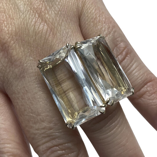 Anel HStern Rua das Pedras confeccionado em ouro nobre 18k com cristais de rocha e diamantes. Aro: 16